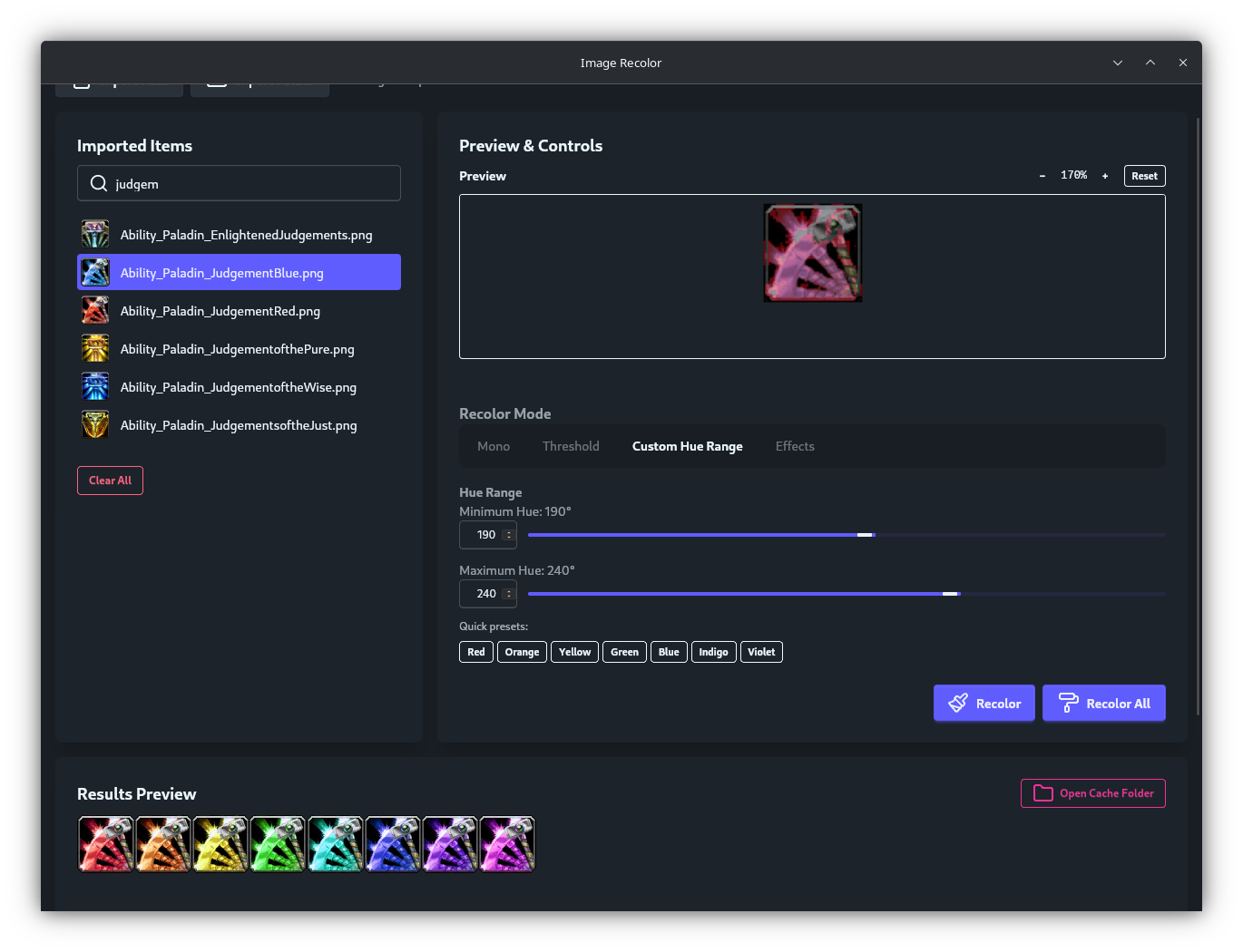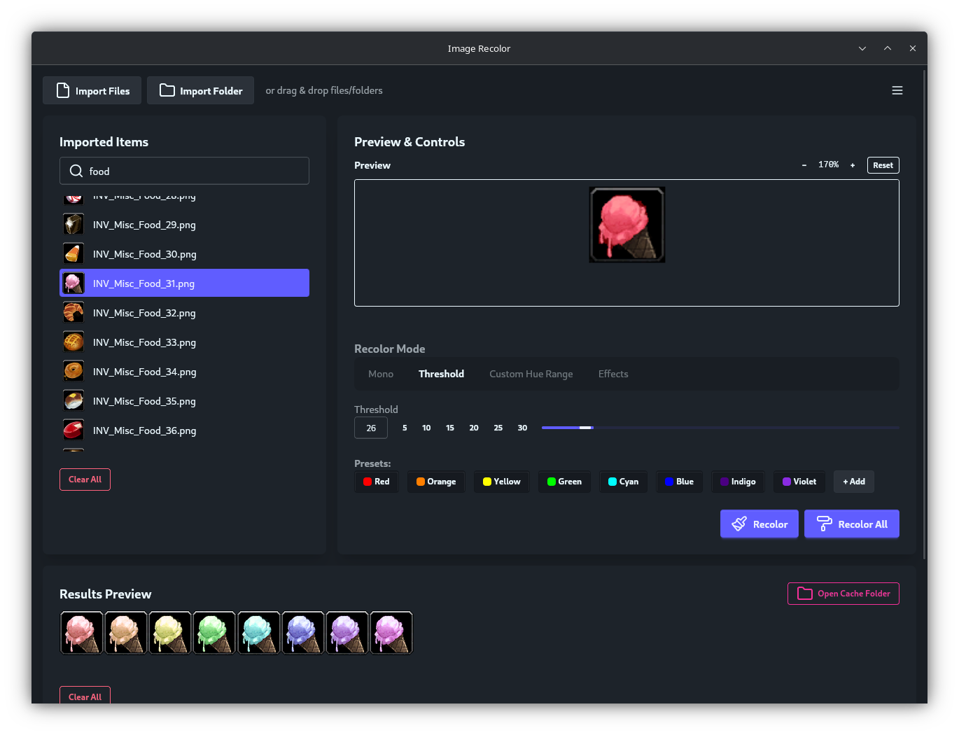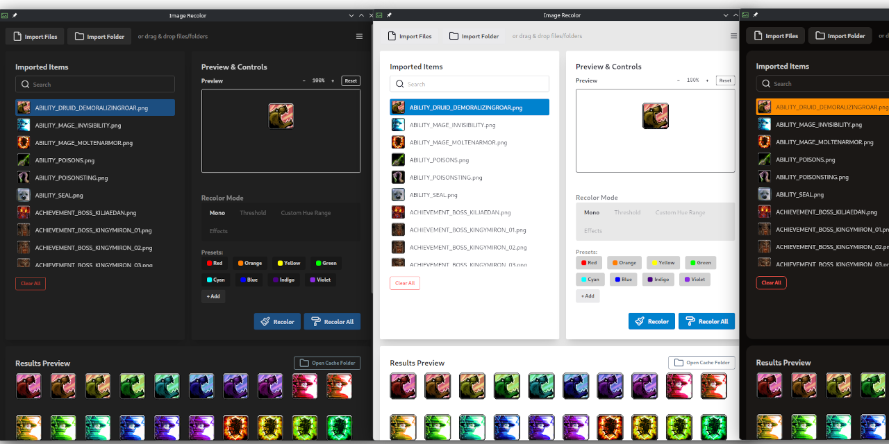 When modding, I needed to recolor textures and icons (6000+), swapping out colors to different presets. The challenge was that WoW uses specialized formats like BLP that most standard image tools don't handle well. So, I built a tool to handle this specific format, and handle batch conversions. I made it more generic to handle more than just BLP images.